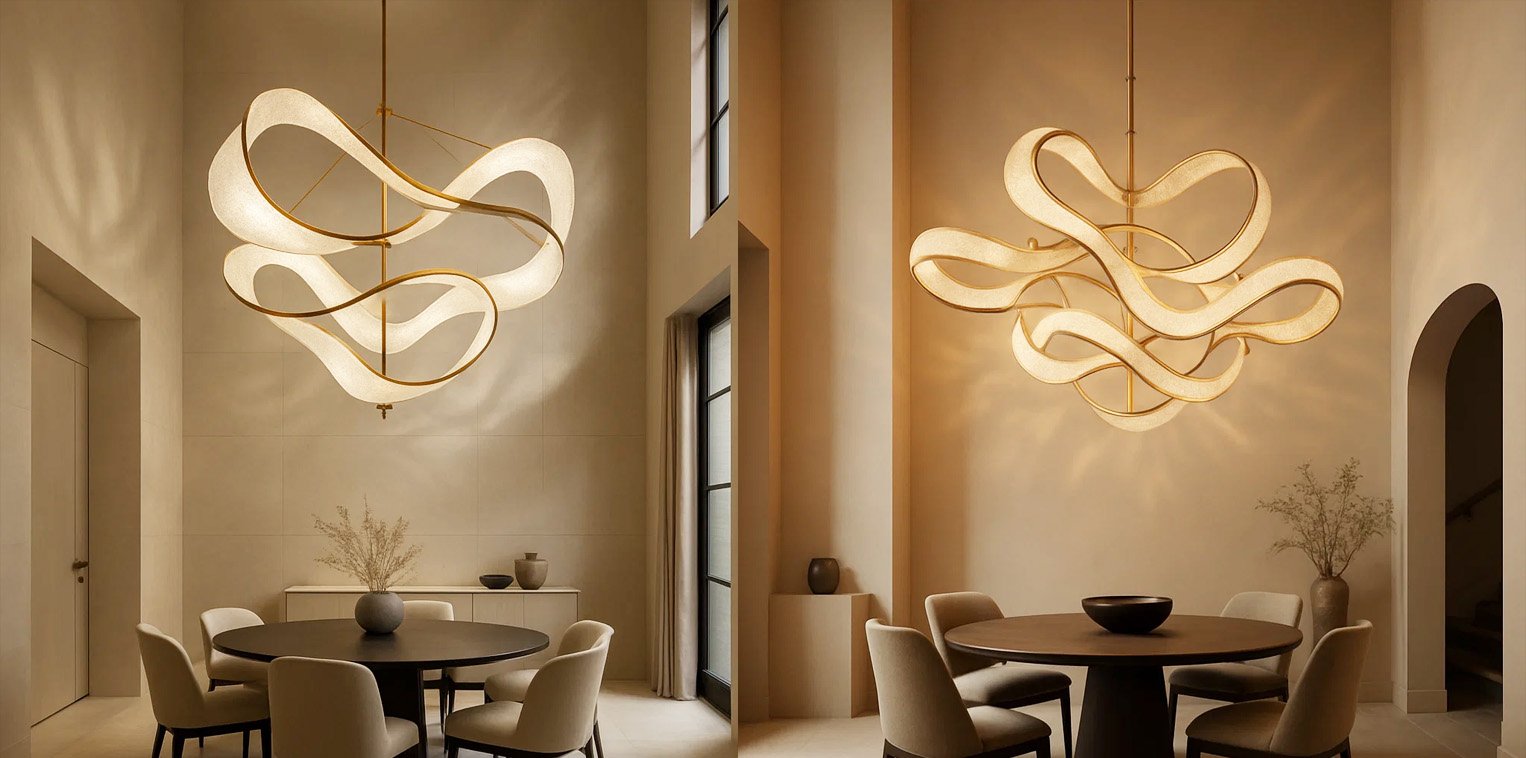 Organic & Sculptural Forms: Moving away from rigid geometry, fixtures now feature natural curves, flowing lines, and soft silhouettes. Look for pieces made from materials like textured glass, natural woods, or ceramics that bring a sense of natural tranquility (Biophilic Design).